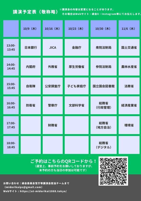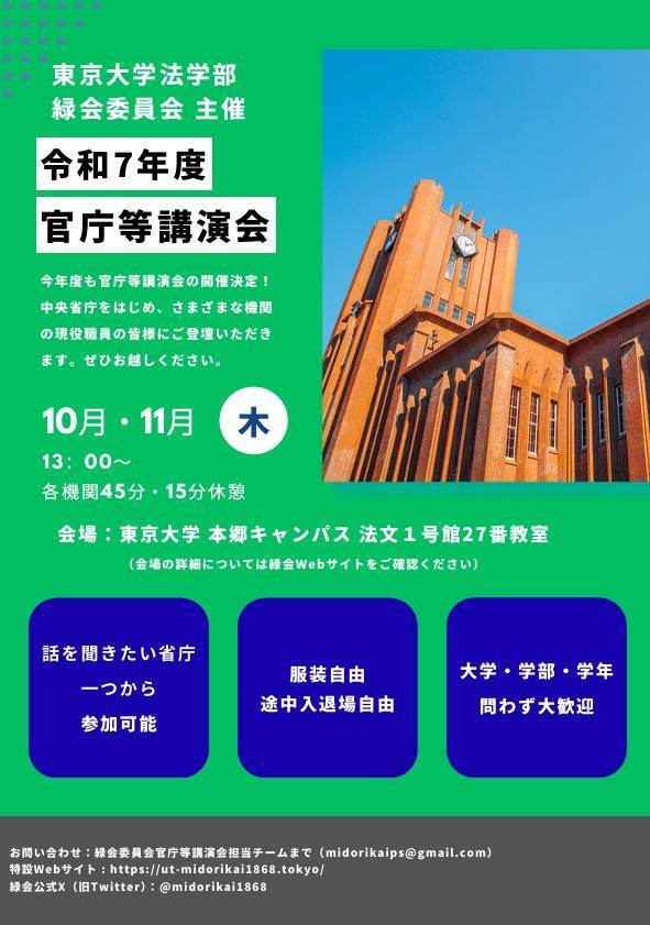 東京大学法学部緑会では本年度も官庁等講演会を開催します。
